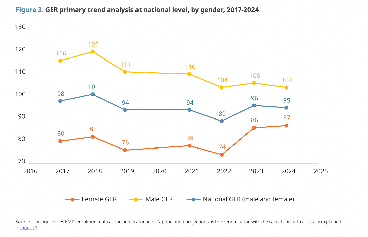 In this Report, the GER is a crucial metric for assessing the participation and capacity of Afghanistan’s education system. It is widely used by UN agencies and education researchers, making it a suitable proxy indicator in situations where reliable age-specific enrollment data is unavailable. The EMIS faces numerous shortcomings, particularly under the current regime, and does not provide students’ ages, which is essential for calculating the Net Enrollment Ratio. In such contexts, GER stands out as the relevant and appropriate measure for cross-provincial and longitudinal analysis.
