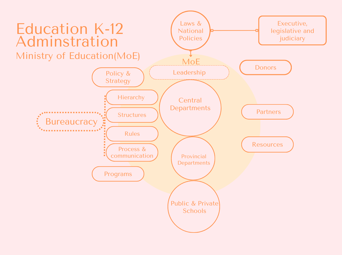 The formation of the Ministry of Education (MoE) bureaucracy, defined as a distinct administrative body for governing the nation's education, occurred in the early 20th century (Naumann, 2011). In the mid-20th century, the MoE's bureaucracy grew, evolved, and expanded. This development aimed to establish a cadre of bureaucrats known for professionalism, efficiency, and strict discipline. In support of this, international organizations and newly trained experts assisted the MoE with achieving these aims (Samady, 2001; Spink, 2005; Majrooh, 1987).